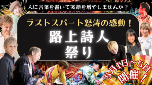 【路上詩人祭り 開催!!】 てんつくマン魂の筆文字100日チャレンジの最後を彩る企画 てんつくマンを含む、路上詩人講師10人のもと 「私も路上詩人になりたい!!」 という熱い想いを持った約100名の仲間が 全国から集まり […]