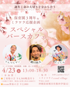 【終了しました】子育てが変わる!自分のことが好きになる!『スペシャルバースカフェ』〜瀬川映太&てんつくマン&にっくんが贈る zoom参加あり